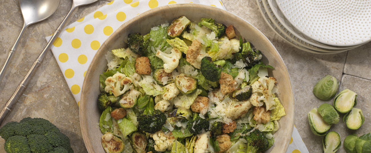 - Empty salad greens from salad kit into a large salad bowl. Add croutons, cheese, and dressing from salad kit packets to salad. Add roasted vegetables to salad. Gently toss to coat.