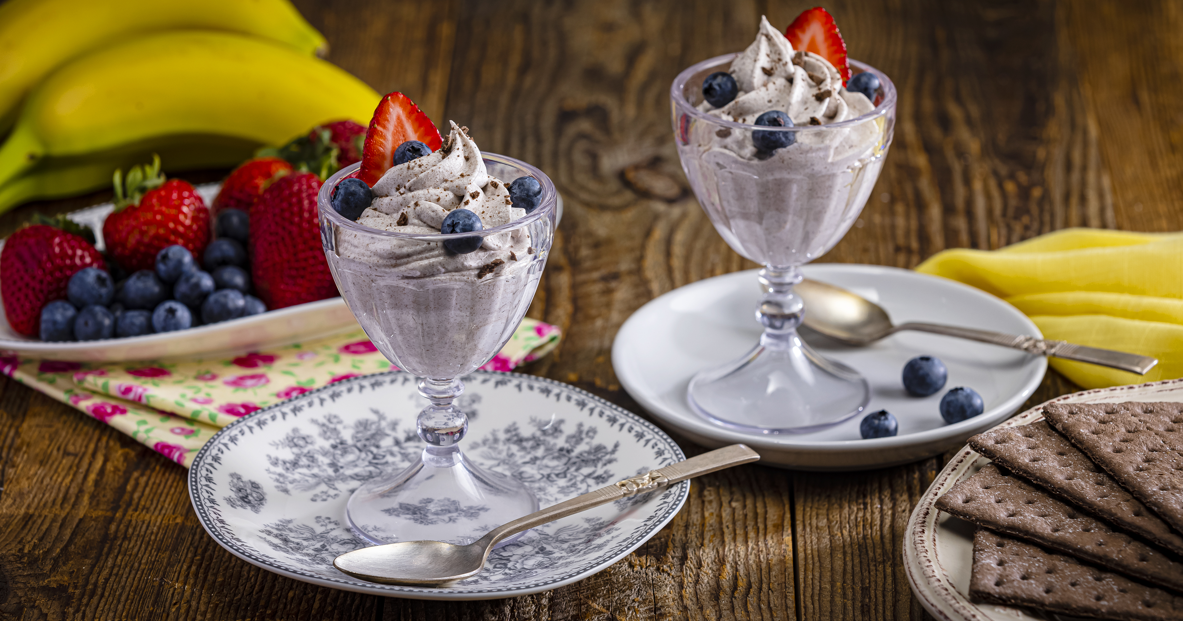 - Divide graham cracker mixture into 4 bowls; top with strawberries and blueberries.