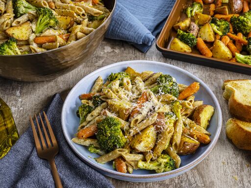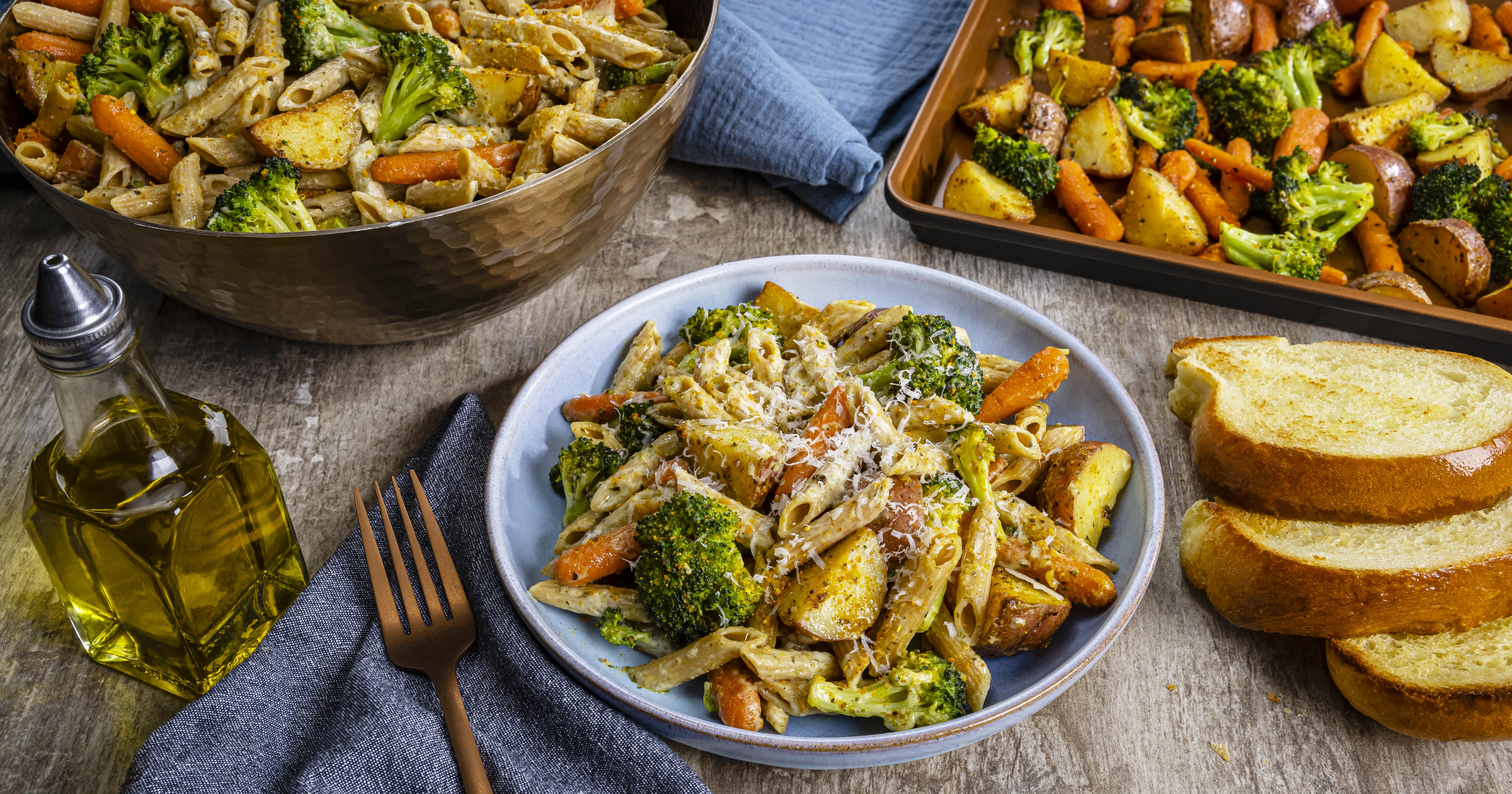 - Prepare 1 DOLE® Lemon Parmesan Sheet Pan Meal Starter Kit as label directs for just the vegetables using all the seasoning.