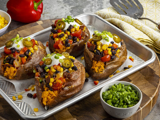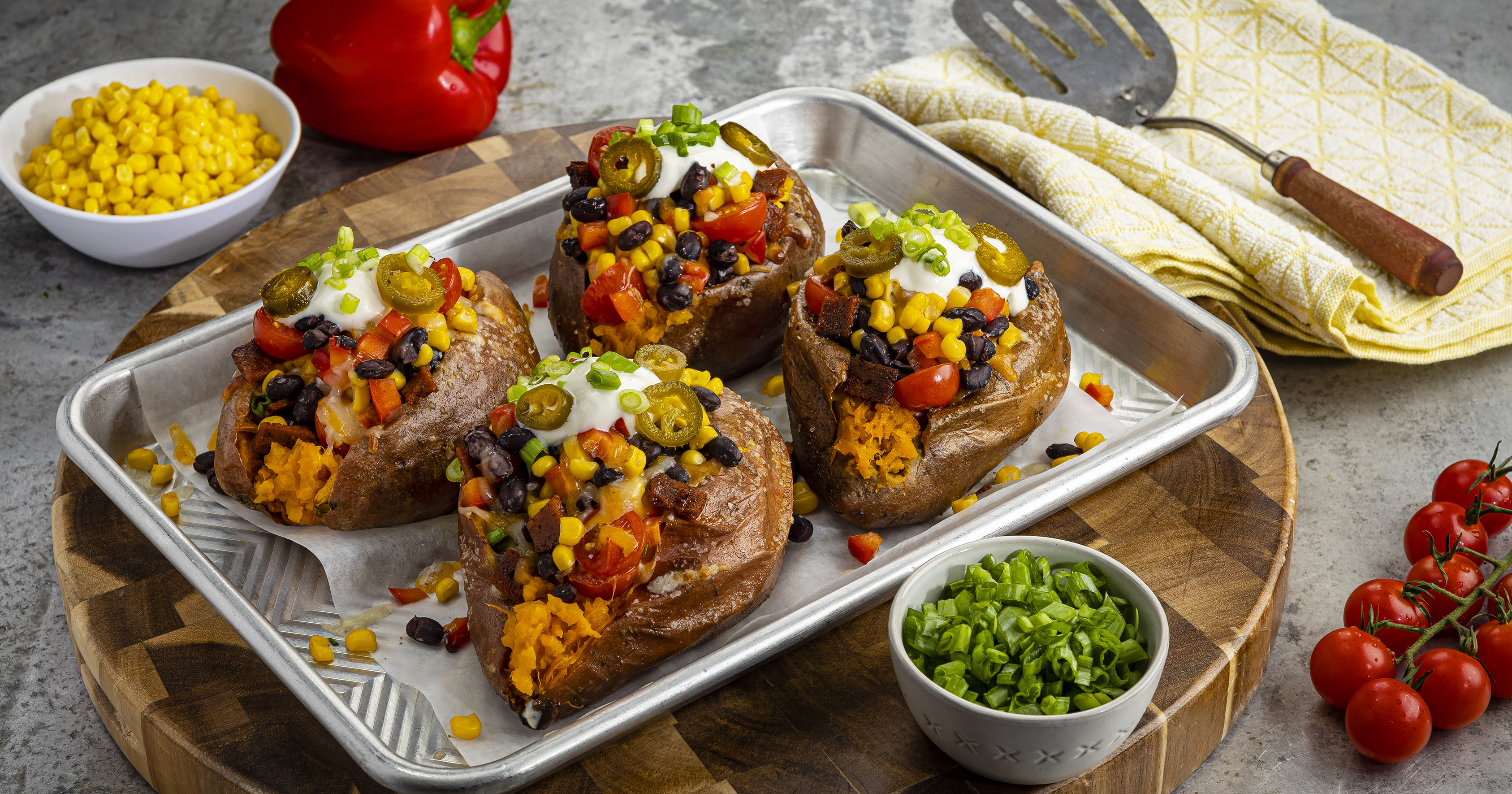 3. Cut a 4-inch slit in the top of each potato; fill with tempeh, pepper, tomatoes, cheese shreds, beans and corn. Bake potatoes 15 minutes or until heated through and cheese melts.