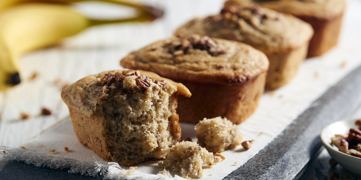 - Whisk flour, sugar, baking powder, baking soda and salt in a medium bowl. Whisk eggs in a large bowl; stir in bananas, yogurt, buttery spread and vanilla extract. Add flour mixture and stir just until combined; pour into prepared pan and sprinkle with pecans. Bake bread 1 hour 5 minutes or until toothpick inserted in center comes out with a few crumbs and top is golden brown.