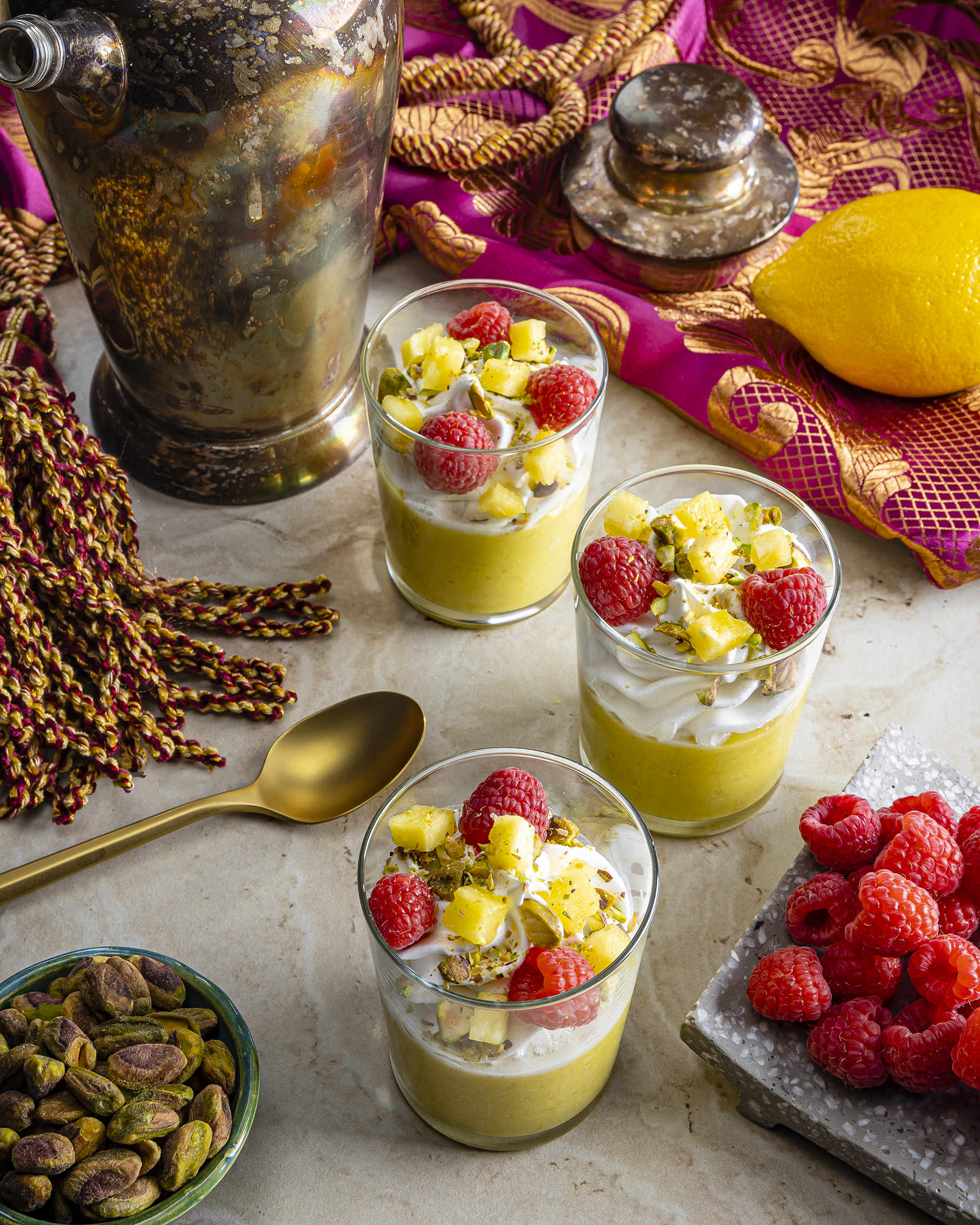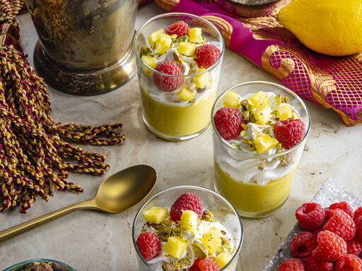 - Divide lemon curd into 8 (4-ounce) decorative plastic cups; top with whipped topping, raspberries, pineapple and pistachios.