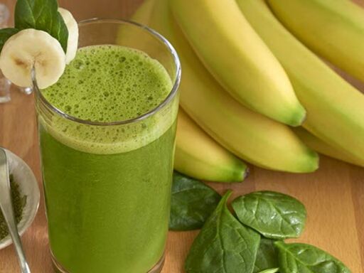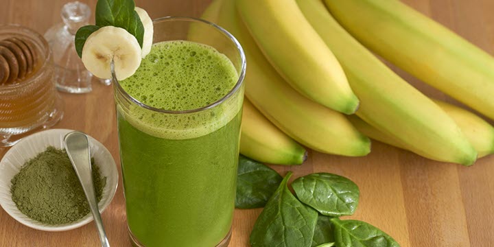 - Combine banana, spinach, Matcha green tea powder and honey in blender or food processor. Cover; blend until almost smooth. Slowly add almond milk until completely blended.
