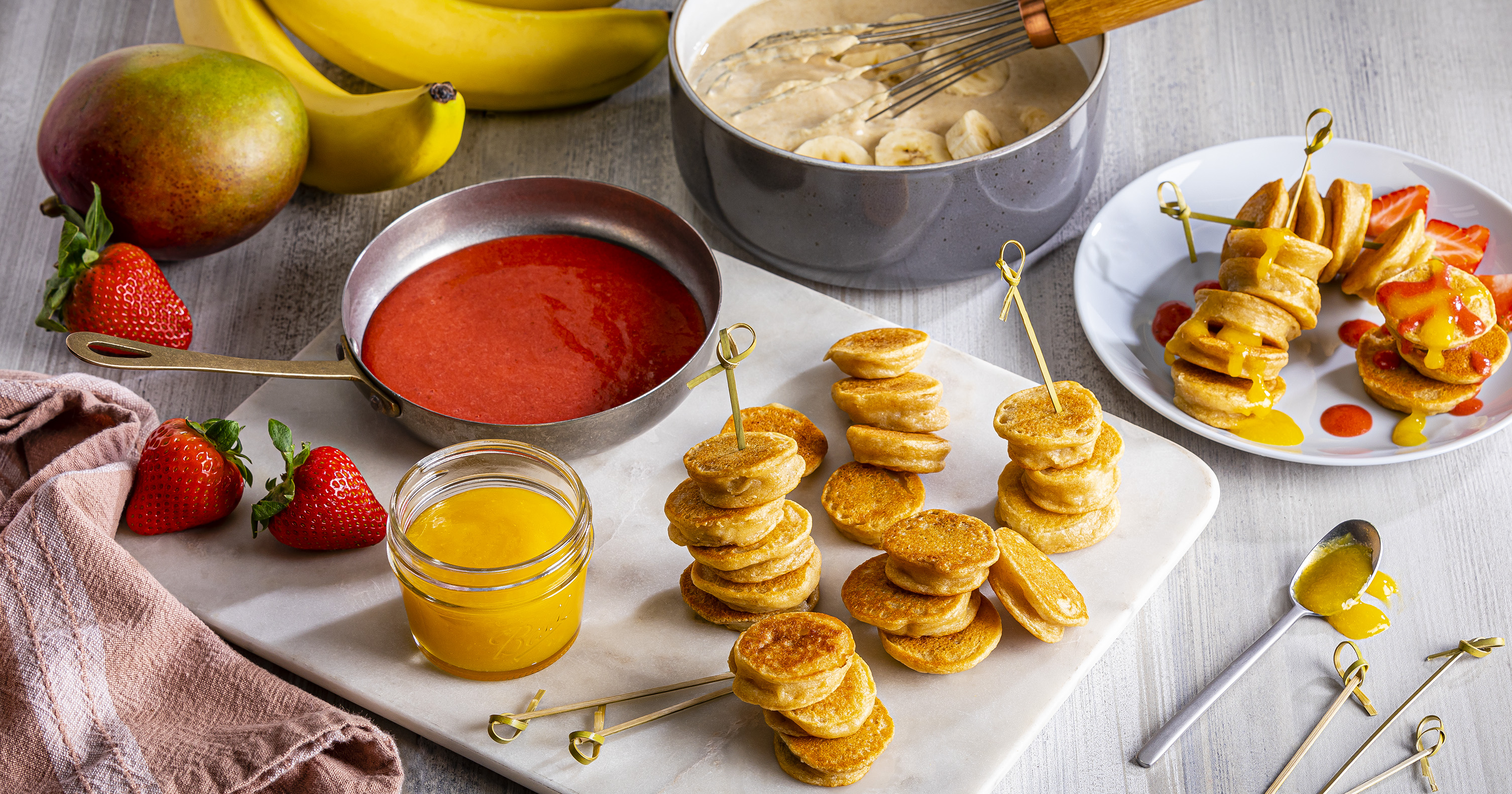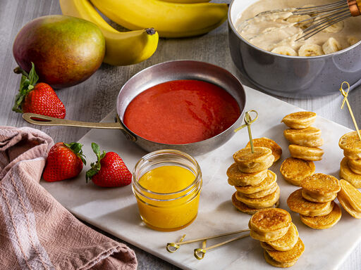 - Serve pancake bites with mango and strawberry mixtures for dipping.