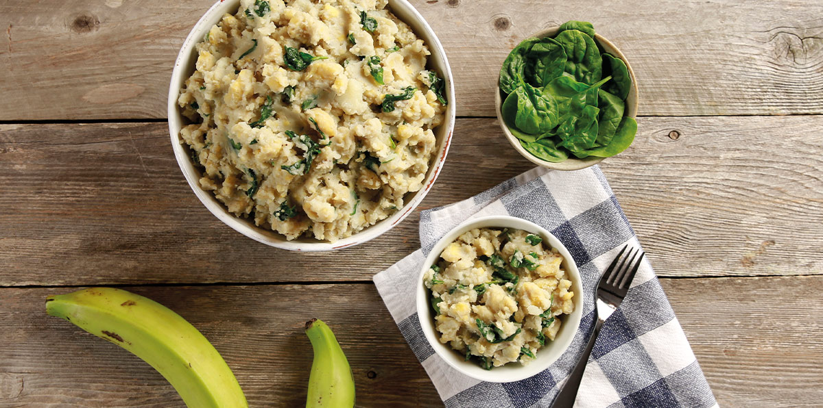 - Add plantain and potato mixture and reserved cooking liquid back to hot saucepan. Mash with a masher tool or the back of a fork until smooth and creamy. Mix in dried basil and season with salt and pepper.