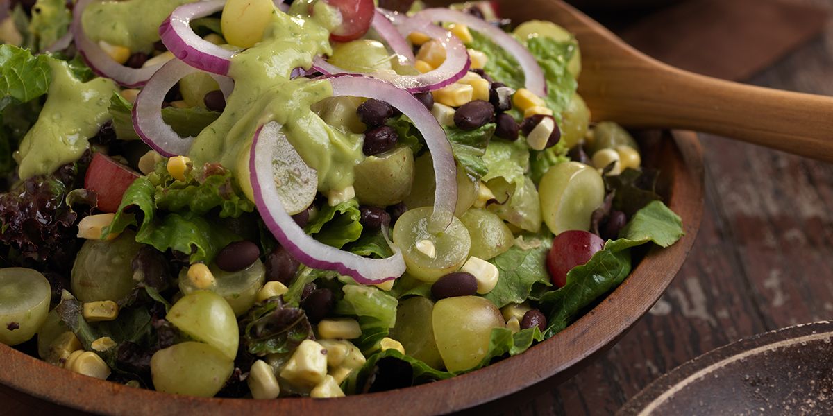 - Mix together lettuces, corn, grapes, and beans in large bowl. Sprinkle sliced onions over salad.