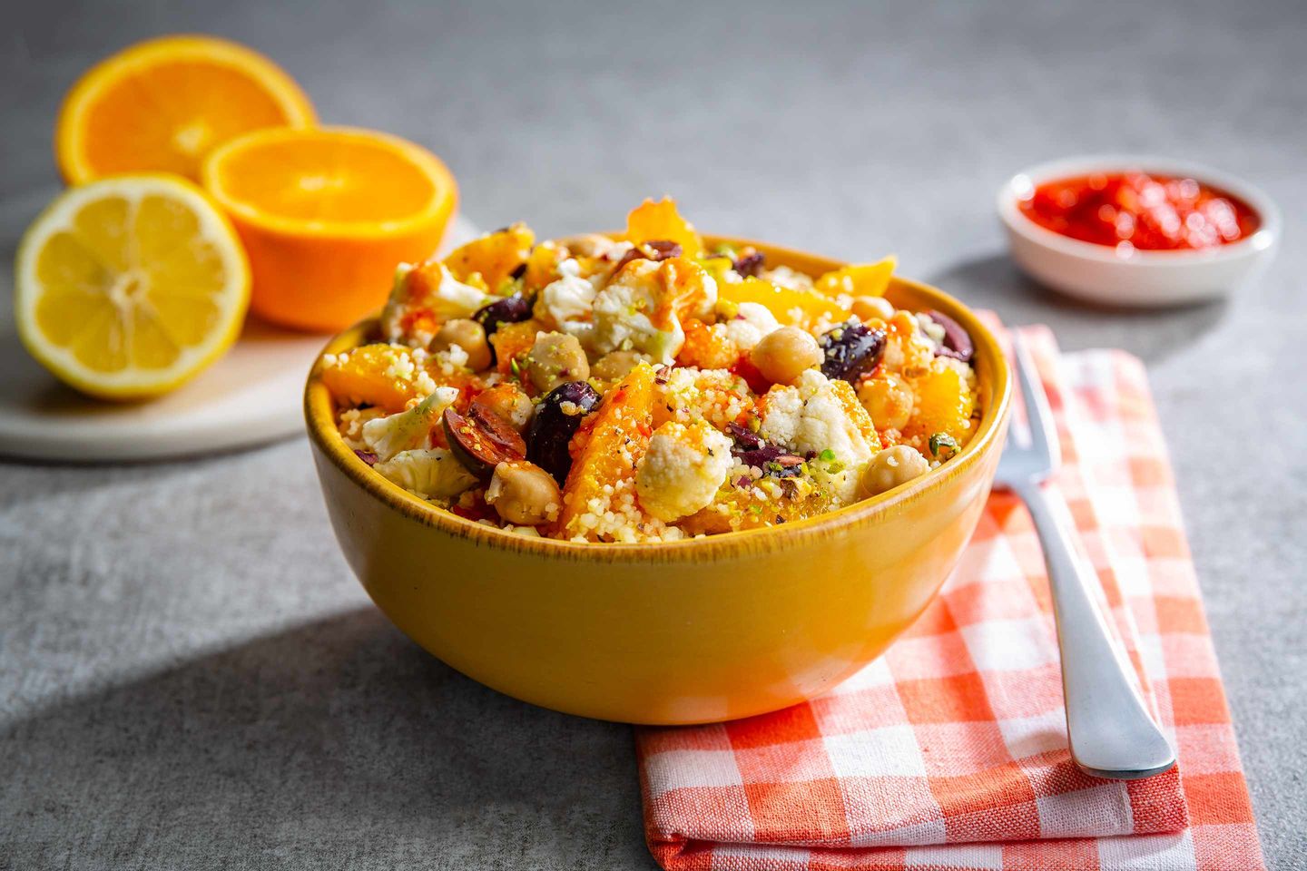 - Squeeze juice from remaining orange into same large bowl (you should have about ½ cup juice); whisk in oil, harissa, salt and pepper. Add cauliflower, chickpeas, olives, couscous and orange segments with their juice; toss. Serve couscous mixture topped with pistachios. Makes about 6 cups.