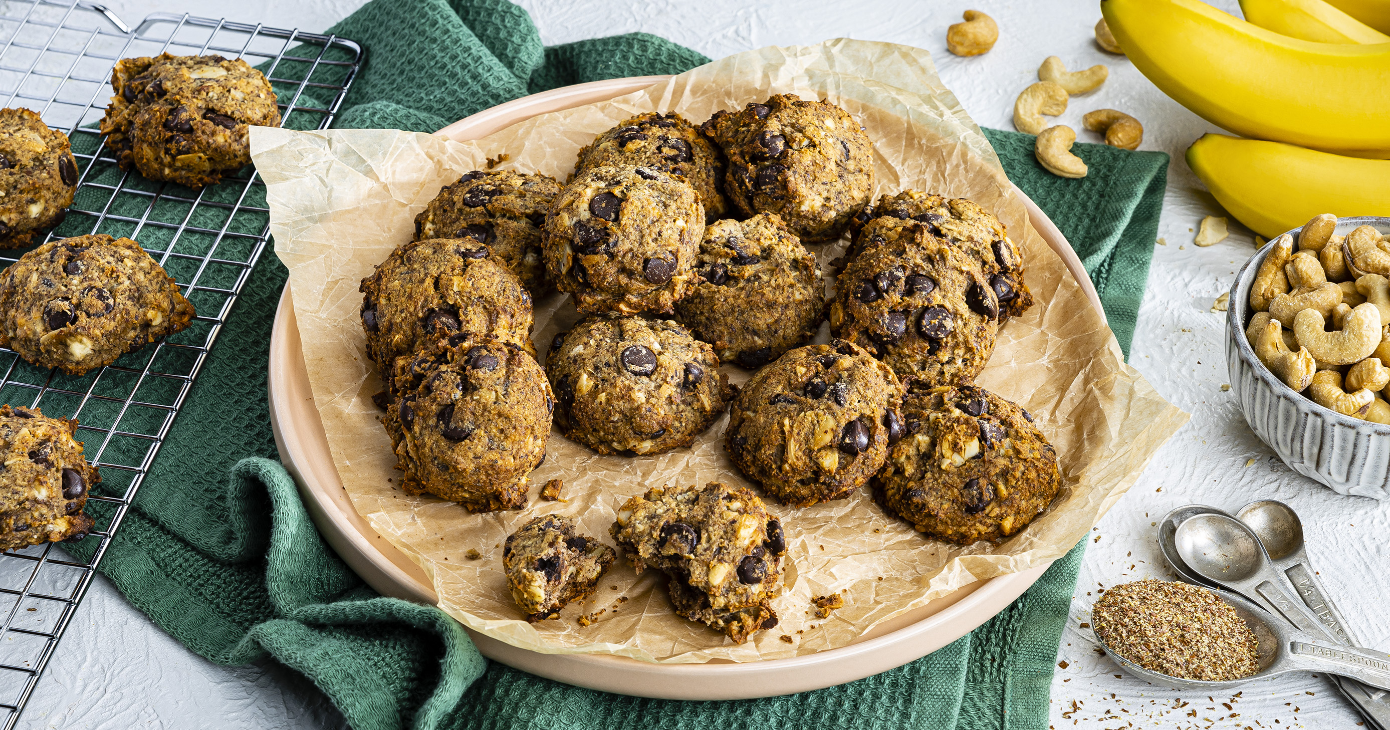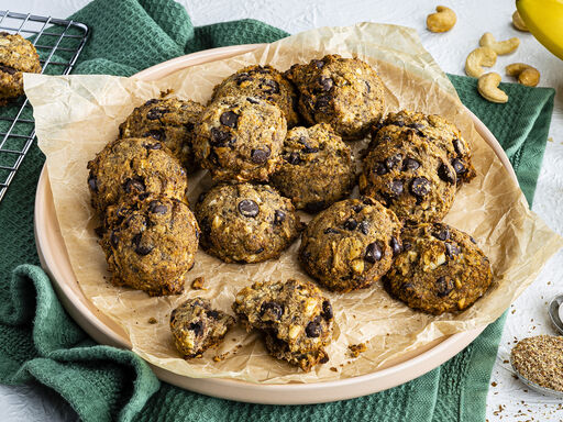 2. Whisk flour, baking soda and salt in a medium bowl. Mash bananas with the back of a fork in a large bowl; stir in vanilla extract and flaxseed mixture. Stir in flour mixture; fold in chocolate chips, cashews and almonds. Using 2 small spoons, drop 1 rounded tablespoon dough, 2 inches apart, on prepared pans; press down gently to ½-inch thickness.