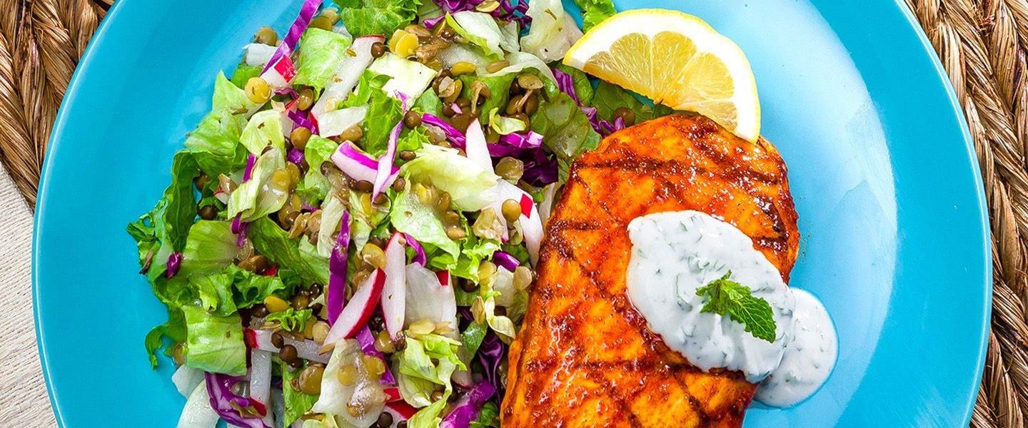 - Serve salad with chicken topped with yogurt mixture; garnish with lemon wedges, if desired.