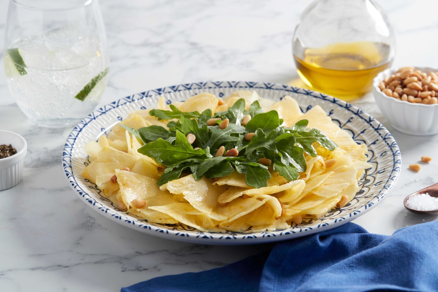 - Arrange pineapple slices on a serving plate; drizzle with remaining oil-vinegar mixture. Top pineapple with arugula mixture; sprinkle with pine nuts.