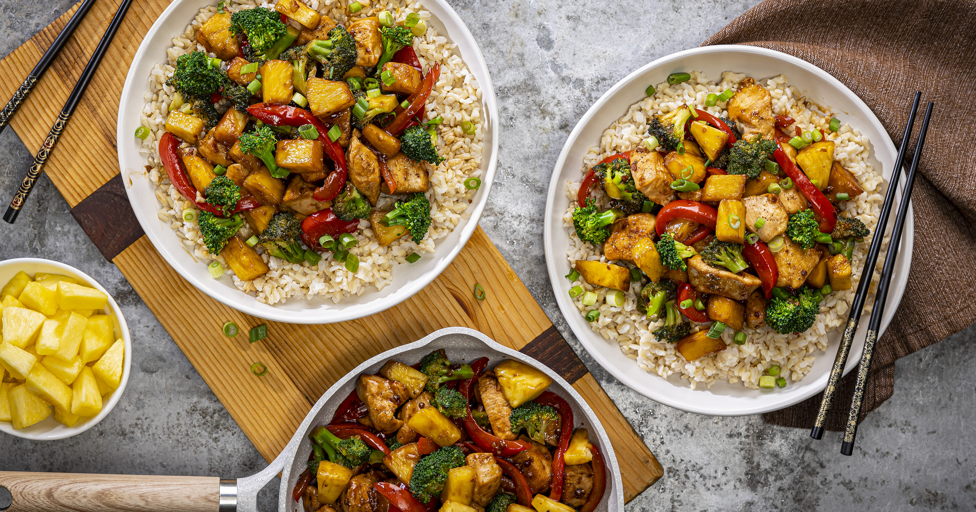 4. Add pepper and broccoli to same skillet; cook 4 minutes or until tender-crisp, stirring occasionally. Add pineapple and chicken; cook 2 minutes or until heated through, stirring occasionally. Stir in garlic mixture; cook 1 minute or until thickened, stirring occasionally. Makes about 4 cups.