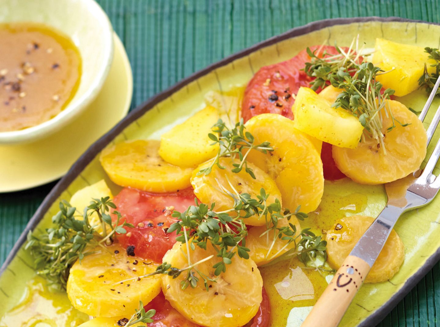 - Put the plantain, tomato and pineapple pieces into a flat dish. Wash the cress and add to the dish. In a bowl, combine the remaining lemon juice with the olive oil, salt, pepper and curry powder and then pour over the salad.