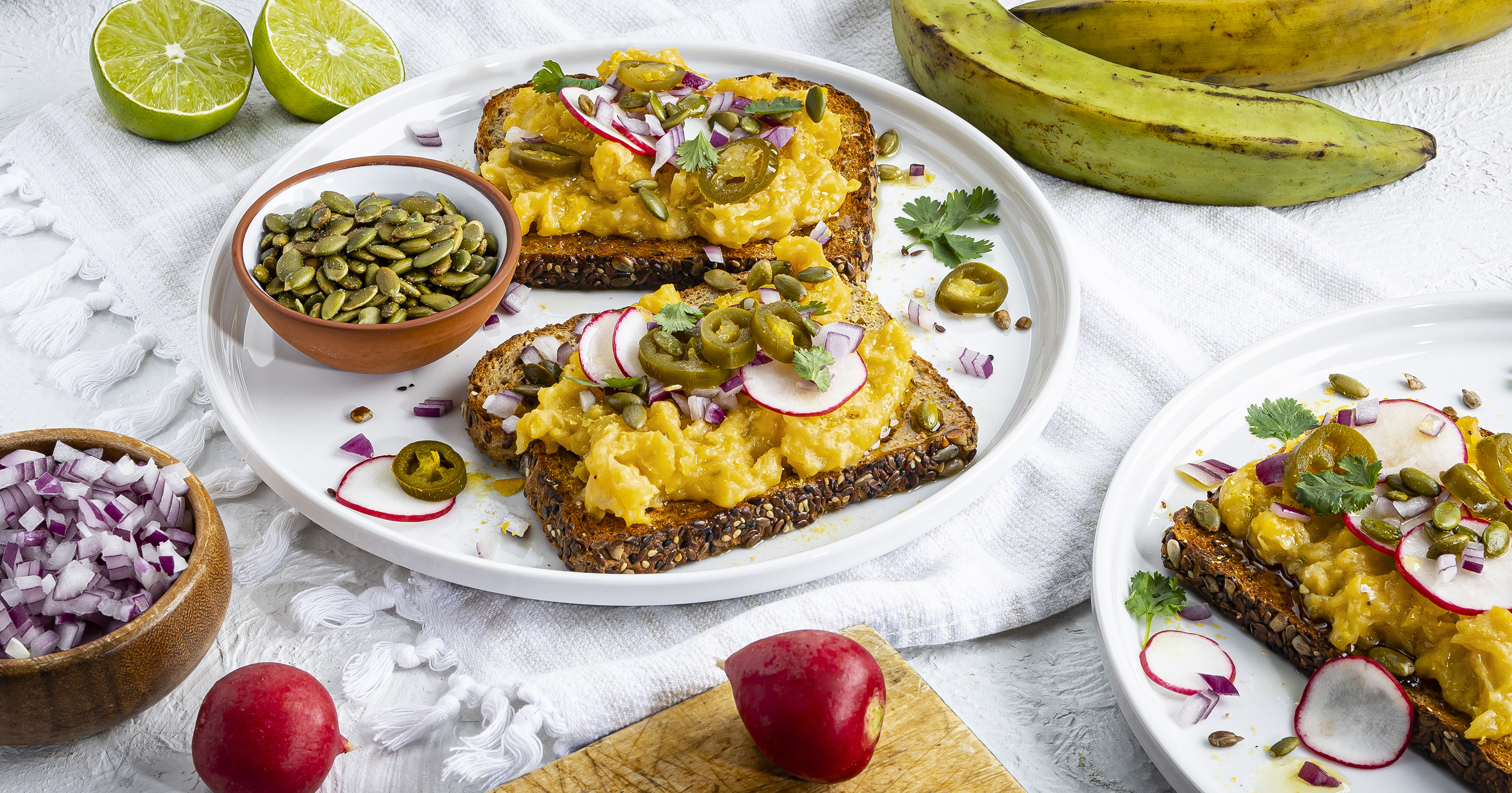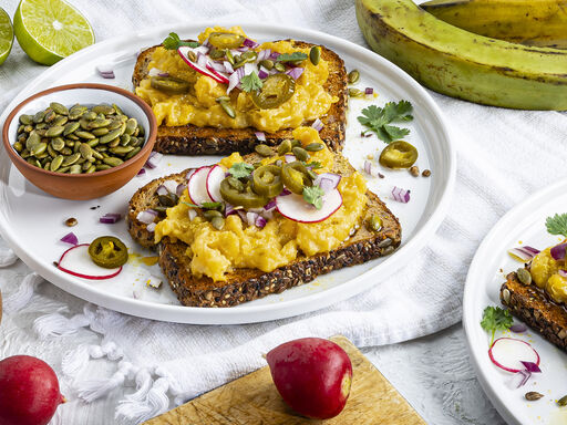 3. Toast bread. Spread toast with plantain mixture; sprinkle with nutritional yeast. Top with radishes, onion, pepitas, jalapeños and cilantro; drizzle with oil. Makes 4 toasts.