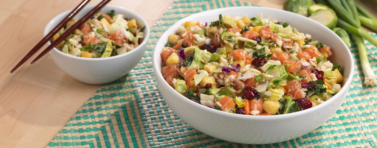 - Empty contents of the salad kit in a large bowl. Add dressing from packet and toss gently to coat. Using a slotted spoon, remove salmon and pineapple from marinade and add to prepared salad. Discard leftover marinade. Serve immediately.