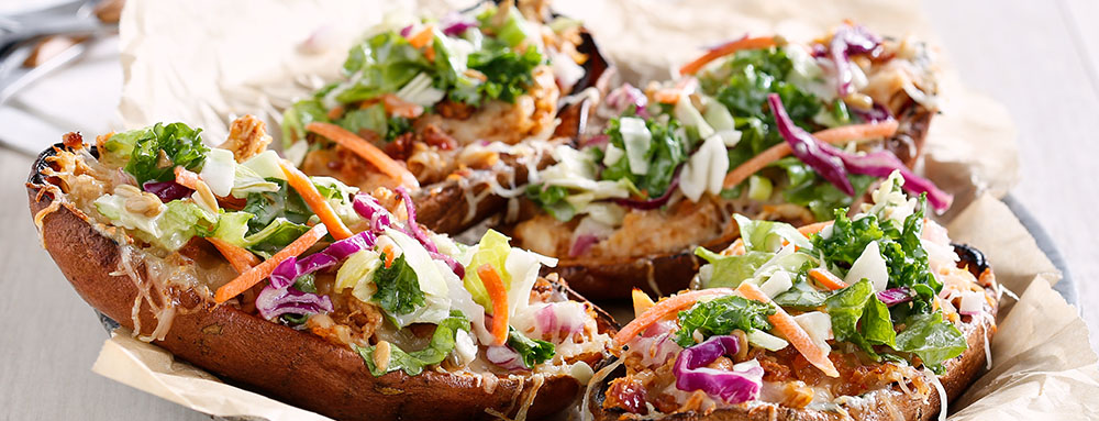 - Stir chicken, onion, barbeque sauce, salt and pepper in a large bowl; spoon into potato skins. Sprinkle potato skins with cheese and bacon from the Sunflower Crunch Kit; broil 1 minute or until cheese is melted.