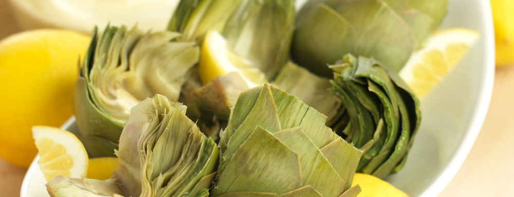 Cut artichokes in quarters; discard inner prickly purple leaves and choke.