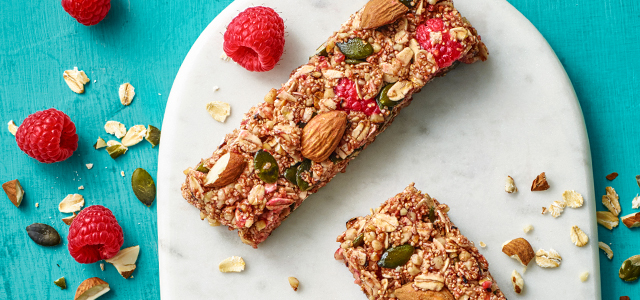 So handy! Granola bars make a tasty snack in between meals. But the store-bought varieties often contain a lot of sugar and are usually packed in plastic. How about making your own bars? Our delicious raspberry and almond bars, made with raspberries, rolled oats, almonds, honey, puffed rice and pumpkin seeds, are quick to make and have what it takes to become your favorite food!