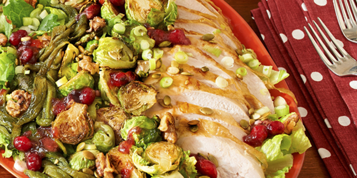 Make next-day magic with holiday leftovers. Roast turkey and Brussels sprouts are tossed with grilled poblano peppers for an infusion of flavor and heat. Dress with cranberry vinaigrette, and garnish with walnuts and pumpkin seeds.