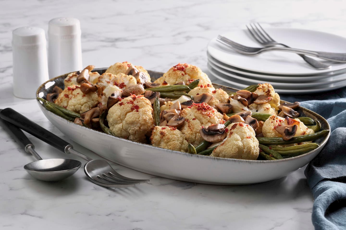 Roasted Cauliflower & Green Beans with Crispy Bacon Mushrooms
