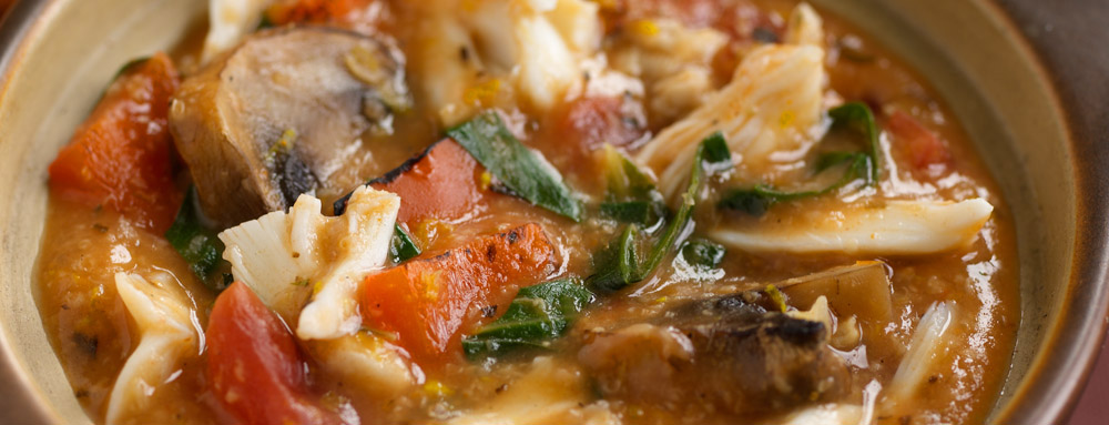 - Combine roasted peppers and mushrooms with broth, tomatoes, collard greens, water, bran, orange peel, herbs and fennel seed in large stockpot. Bring to a boil. Reduce heat and simmer 5 minutes. Add oysters and cook 5 minutes longer. Add crabmeat; heat through.