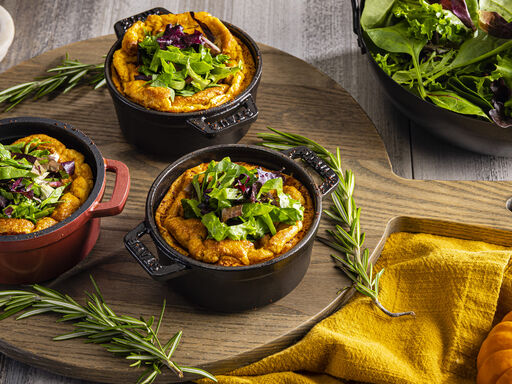 Guests will delight in this fluffy, savory pumpkin soufflé crowned with DOLE Organic Spring Mix. This recipe matches hearty fall flavors with lightly tossed greens for a dramatic holiday presentation. And with the crown of green, there’s no need to fret about falling soufflés.
