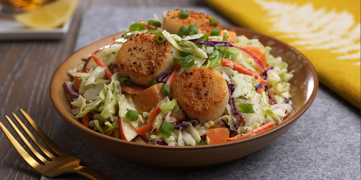 - Sprinkle scallops with salt and pepper. Heat oil over medium-high heat, in large nonstick skillet, until very hot but not smoking; add scallops and cook 5 minutes or until golden brown, turning once. Serve scallops over slaw mixture sprinkled with onion.
