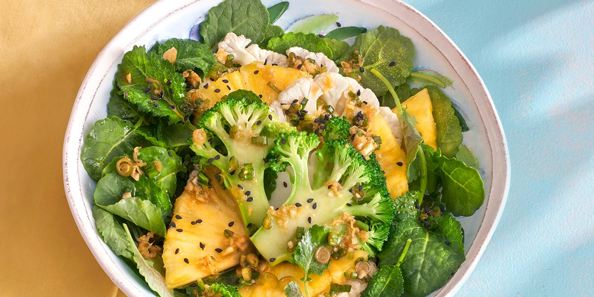 - Toss cauliflower, broccoli, pineapple and salad greens with Sesame-Ginger Vinaigrette.