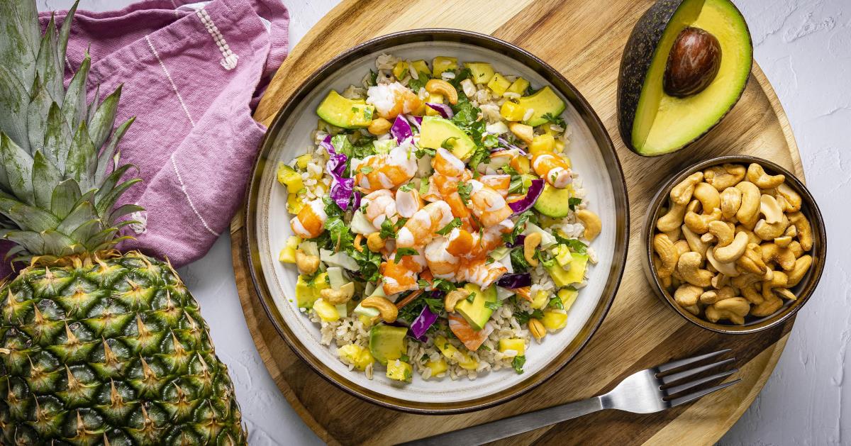 - Serve rice in bowls topped with avocado, shrimp and salad; top with cashews and season with pepper to taste, if desired. Garnish bowls with cilantro, if desired.