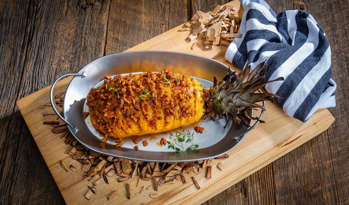 Smoked Hasselback Pineapple with Spiced Turkey Chorizo & Onion