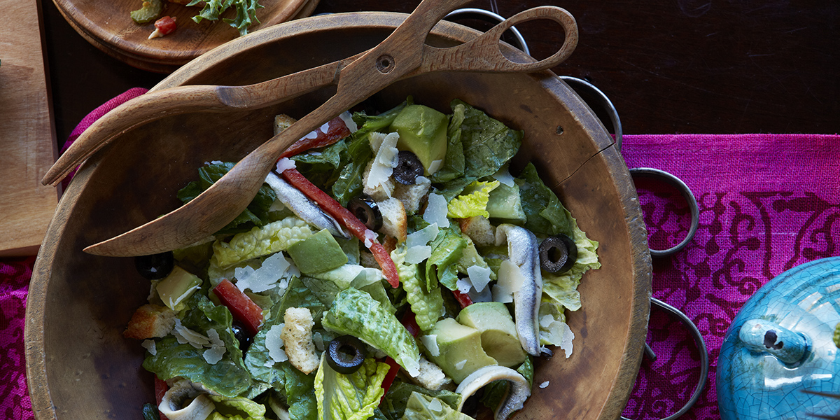 A staple of Mediterranean cuisine, briny anchovies and black olives make the perfect, platter-friendly snacks. Here, we’ve thrown them together in a Spanish Caesar salad brightened up by sweet-savory balsamic, crunchy bell peppers and a little avocado for a creamy, heart-healthy touch.You prefer poultry? No problem! Try swapping anchovies for a half-cup of pulled or diced cooked chicken to add extra protein that pairs just as easily with olives, cheery bell peppers and balsamic.