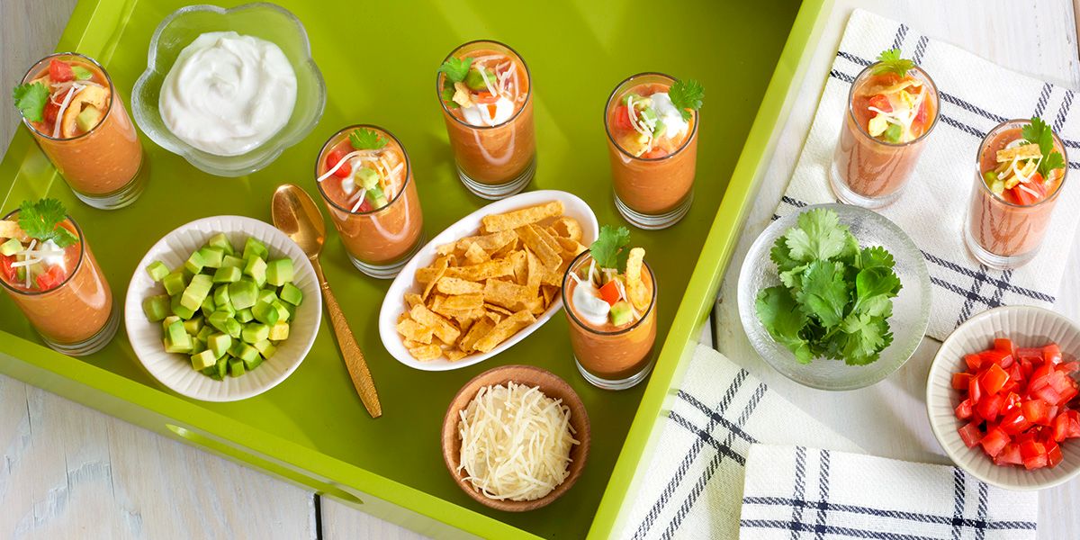 2. Divide between 4 serving bowls or 8 shooters. Top soup with avocado, tomato and reserved cheese and tortilla strips. Add swirl of sour cream and chopped cilantro. Serve chilled or room temperature.