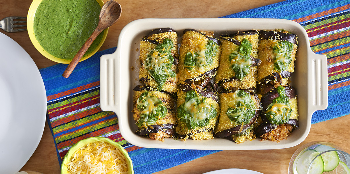 These “enchiladas” are made of thin slices of cooked eggplant rolls slathered with a layer of spinach and herb salsa verde, roasted cauliflower pieces, quinoa and shredded cheese. The salsa verde brings this dish to life with a balanced blend of pureed spinach, herbs, garlic walnuts and lemon.