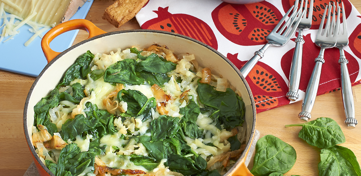Classically French, a soubise combines risotto with onions slow cooked to create a most delectable dish. We have added a modern twist by folding in fresh, DOLE® Spinach and shredded Gruyere just as it comes right out of the oven. The perfect side dish or accompaniment to grilled fish, chicken or roasted vegetables.