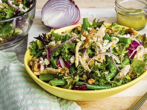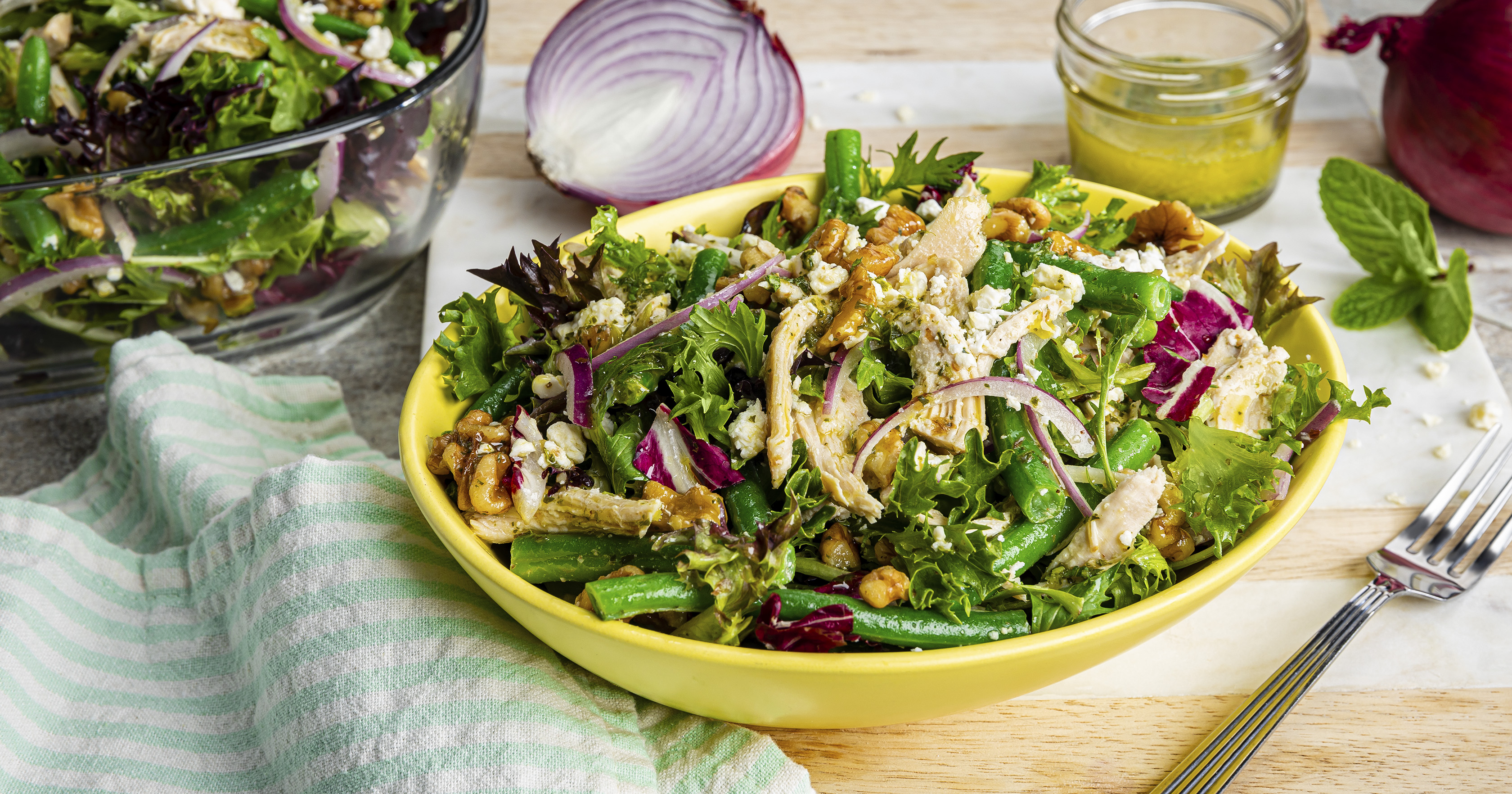 - Combine spring mix, chicken, cheese, walnuts and onion, in large bowl. Toss with mint vinaigrette to evenly coat.