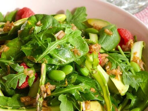 - Toss baby spinach, arugula and asparagus with vinaigrette. Season to taste with salt and pepper.