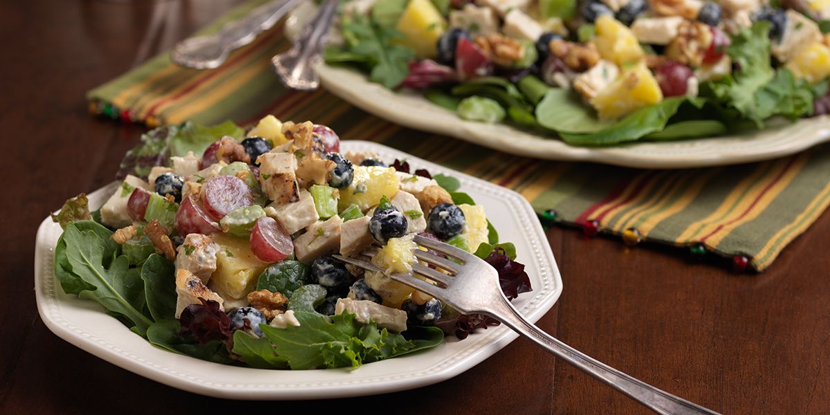- Stir together yogurt and mustard in a medium bowl. Stir in chicken, apples, blueberries, pineapple, celery, and mint. Toss to evenly coat.