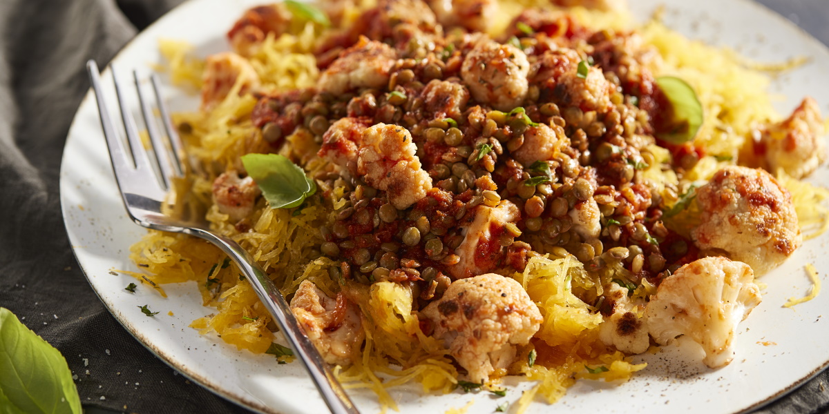 Stewed Cauliflower & Lentils Over Spaghetti Squash