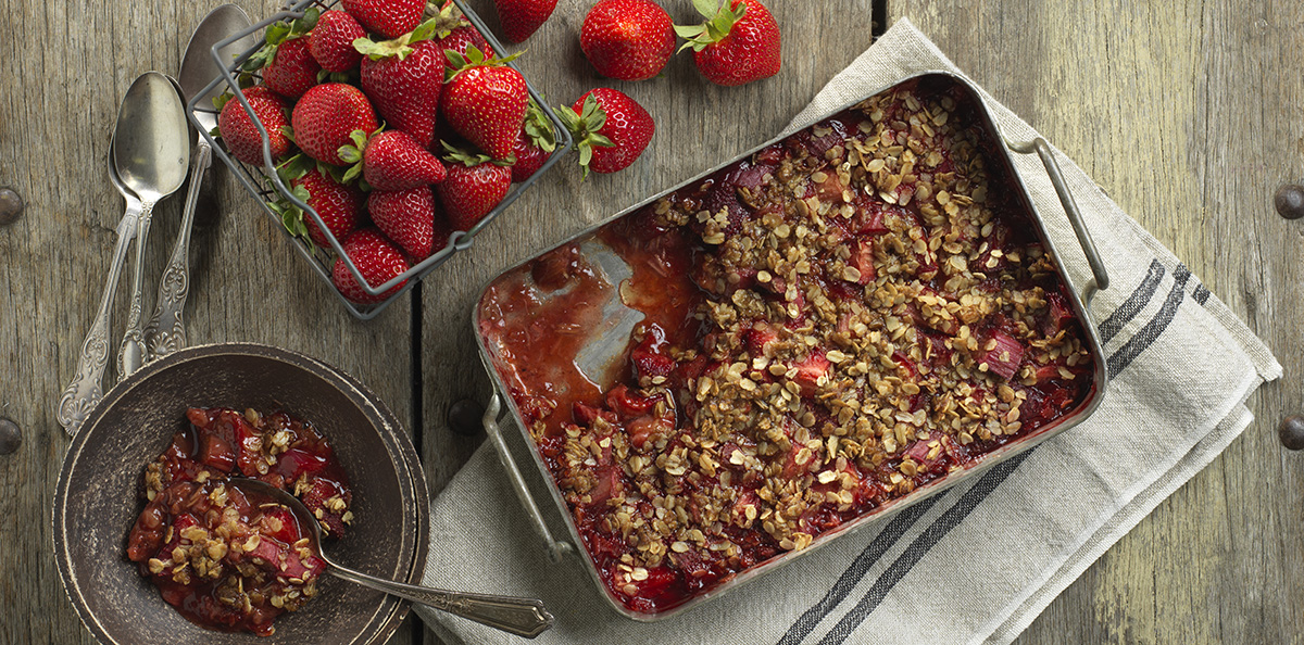 Sweet and tangy rhubarb and strawberries are combined in the crisp with an oatmeal crumb topping.