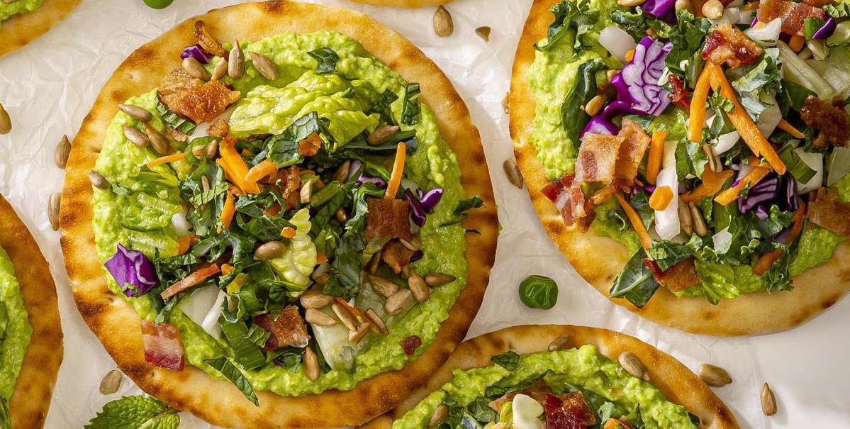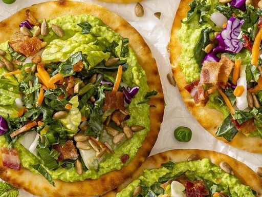 - Toss salad blend with dressing from salad kit. Divide salad among the flatbreads. Sprinkle salad with sunflower seeds and applewood smoked bacon from the salad kit.