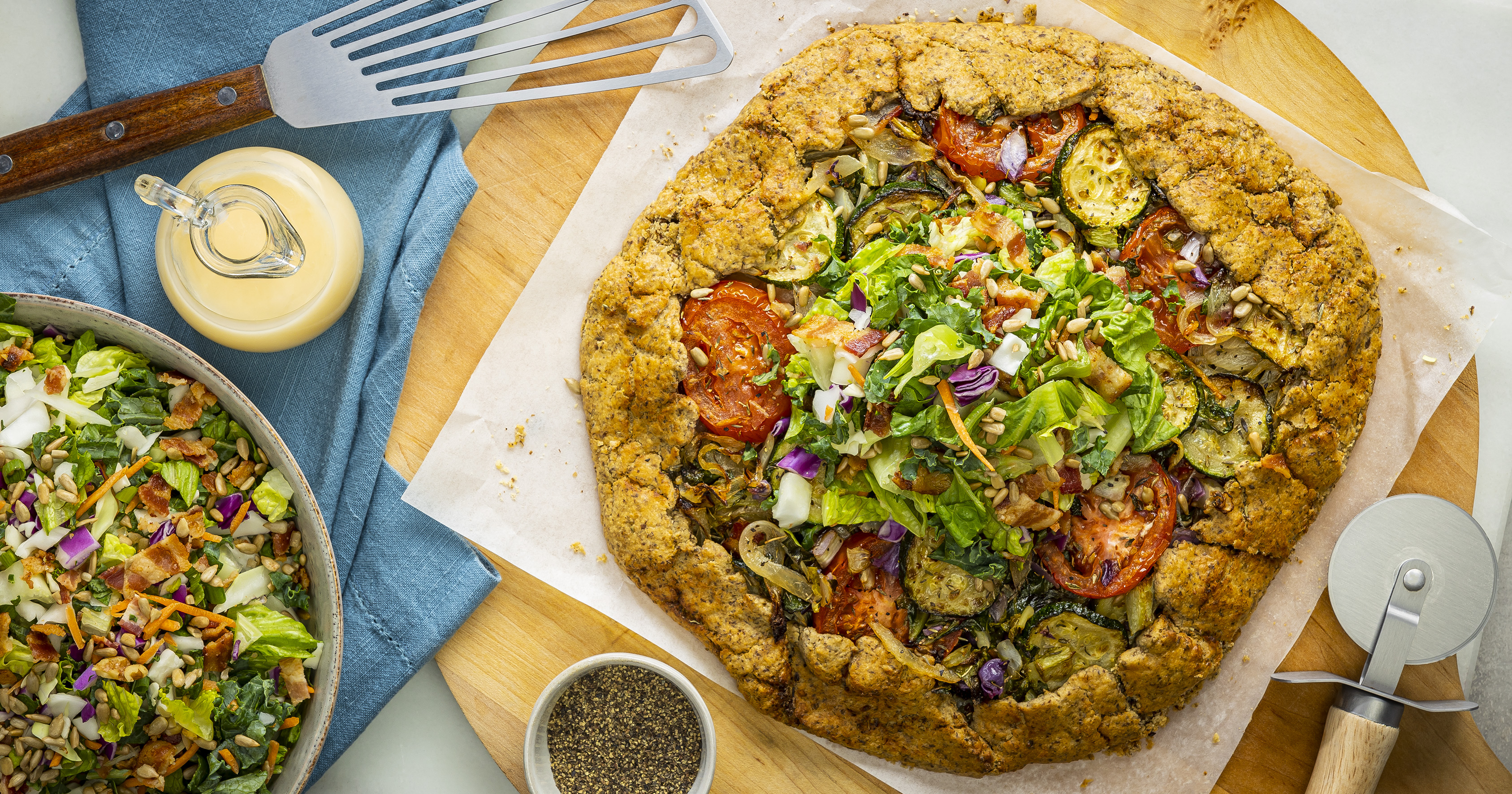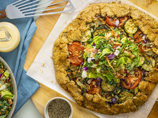This galette, a rustic type of French pie, is a delightful way to eat your vegetables. The flaxseed in the tender crust lends a hint of woodsy flavor, balancing perfectly with the smoky flavor of the sweet & savory DOLE® Chopped Sunflower Crunch Salad. A wonderful taste of France.