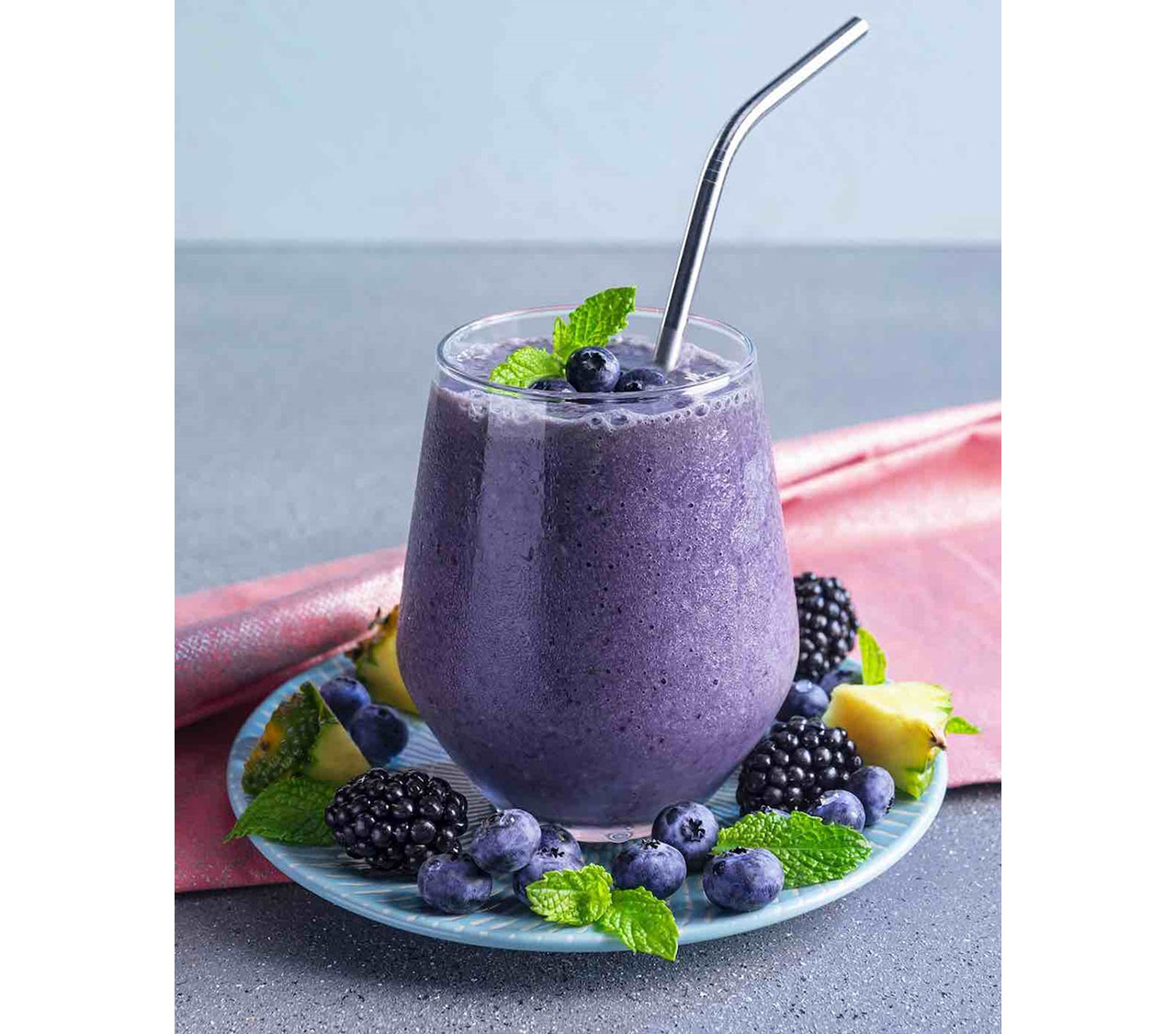 - Purée all ingredients in a blender on high until smooth; serve garnished with blueberries and mint, if desired. Makes about 5 cups.