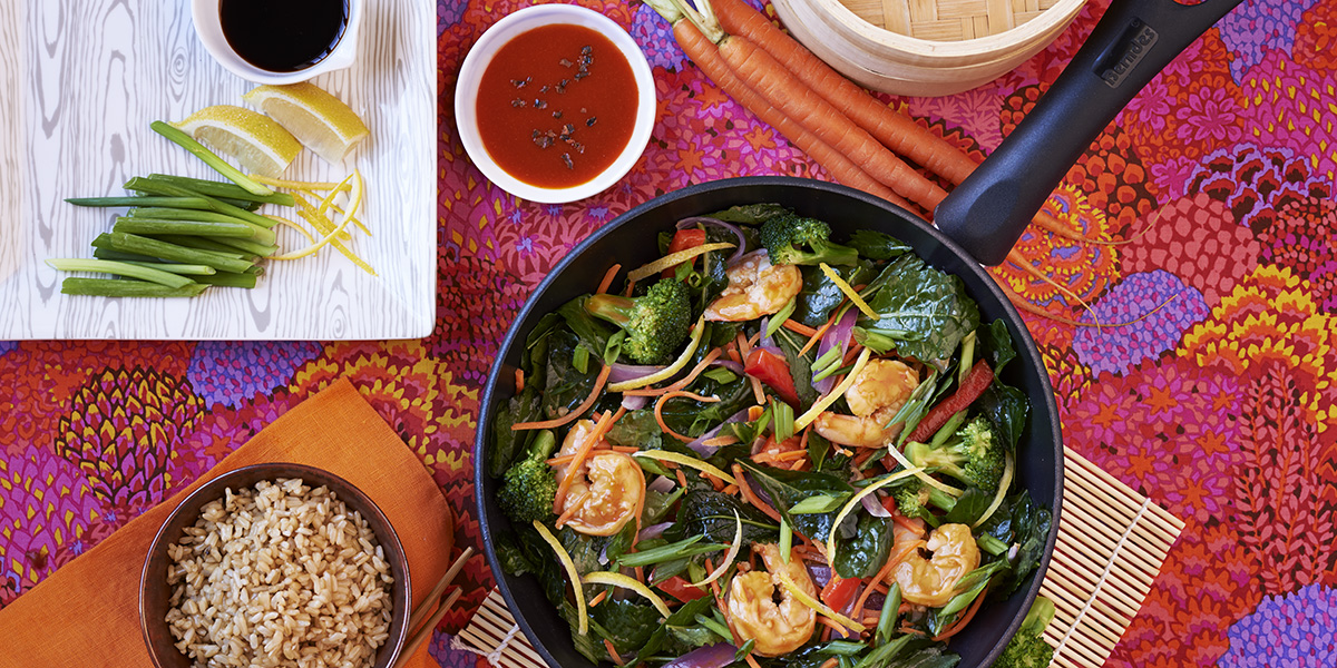 - Add garlic and onion to pan; stir fry 1 minute more. Add bell pepper, broccoli and carrots; cook 5 minutes or until vegetables are crisp tender, adding additional tablespoons of water, one at a time, to keep pan moist. Add sauce; bring to boil. Reduce heat. Stir in baby kale and cook until just wilted. Return shrimp to pan, toss to coat. Serve over hot brown rice; garnish with green onion and lemon zest.