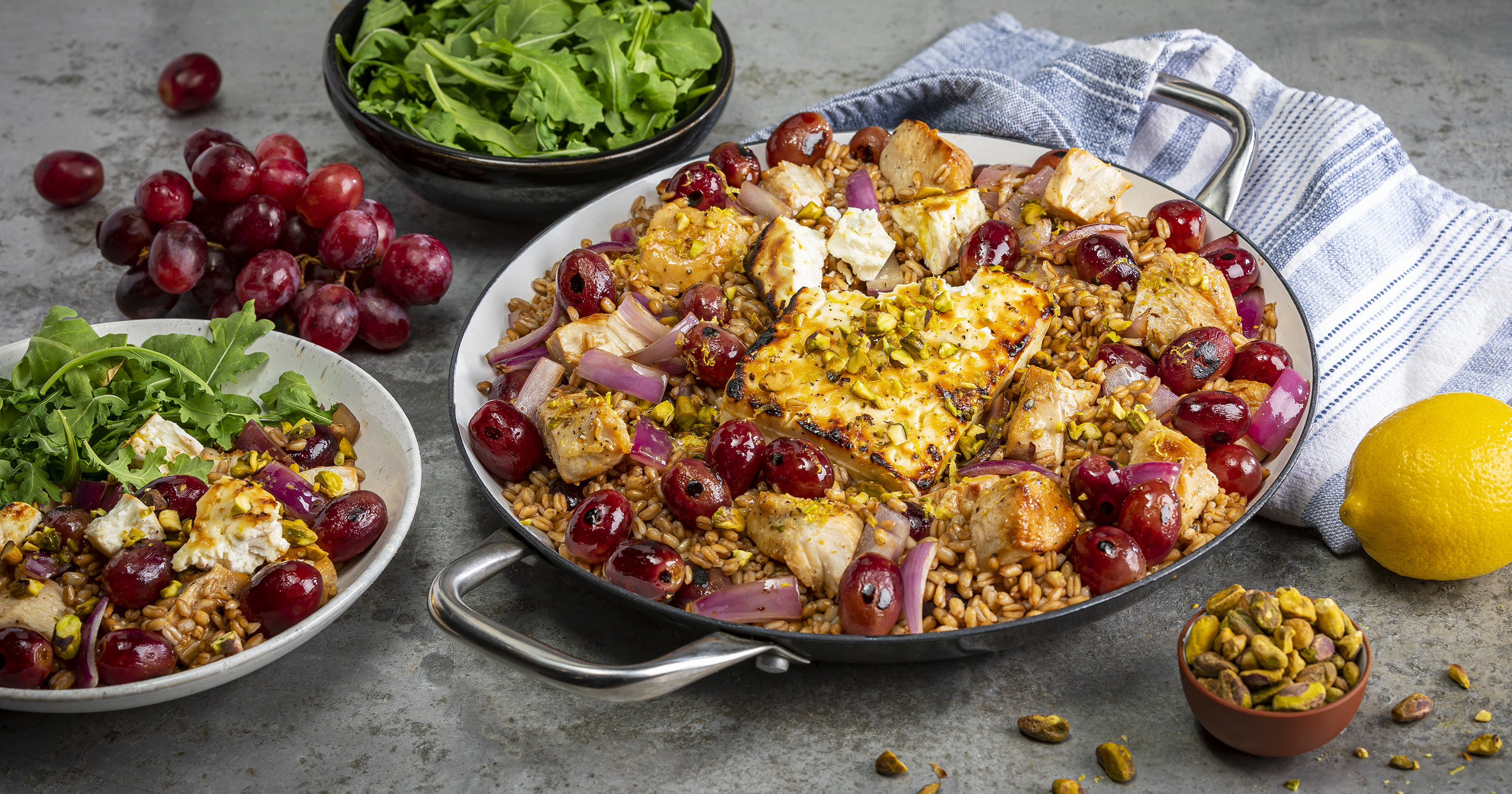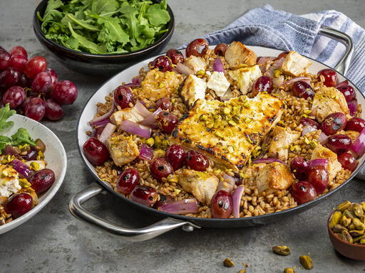 - Arrange chicken around edge of skillet; place cheese in center of skillet. Add grapes and onion over chicken; drizzle cheese and chicken mixture with 3 tablespoons lemon juice and zest, honey and remaining 1 tablespoon oil. Transfer skillet to oven; broil 10 minutes or until cheese is browned and internal temperature of chicken reaches 165°F. Break up cheese with side of a spoon.