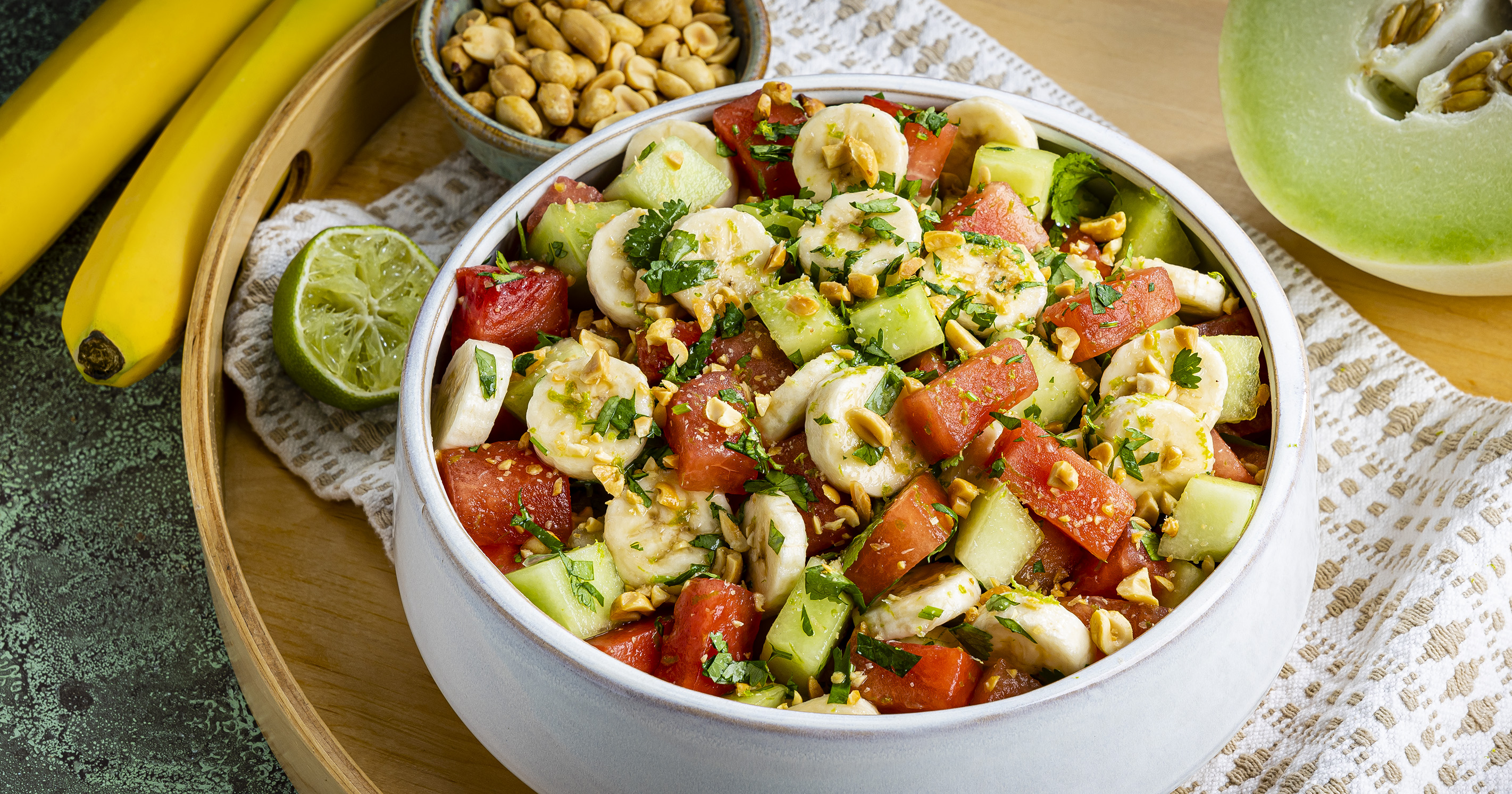 - Slice bananas; toss with fruit mixture. Serve fruit topped with peanuts, if desired.