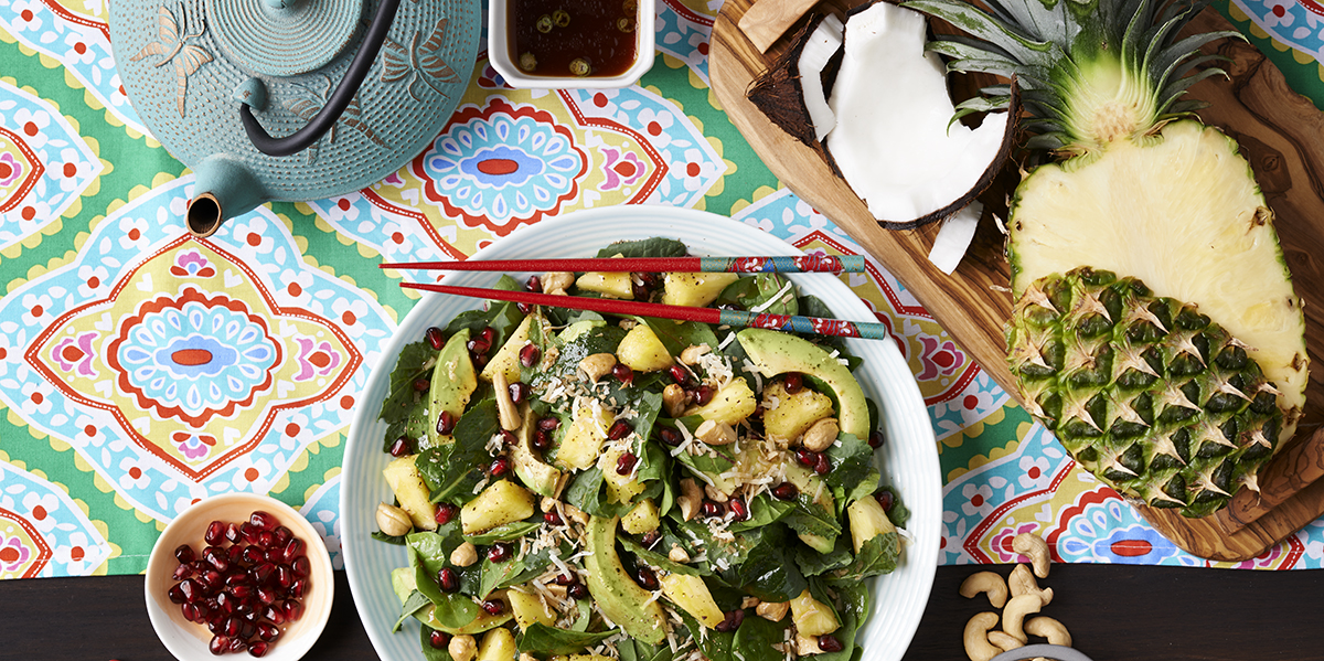 - Place salad blend on large platter or serving plates; top with pineapple, avocado, nuts, coconut and pomegranate seeds. Drizzle vinaigrette over salad. Season with salt and pepper, to taste.