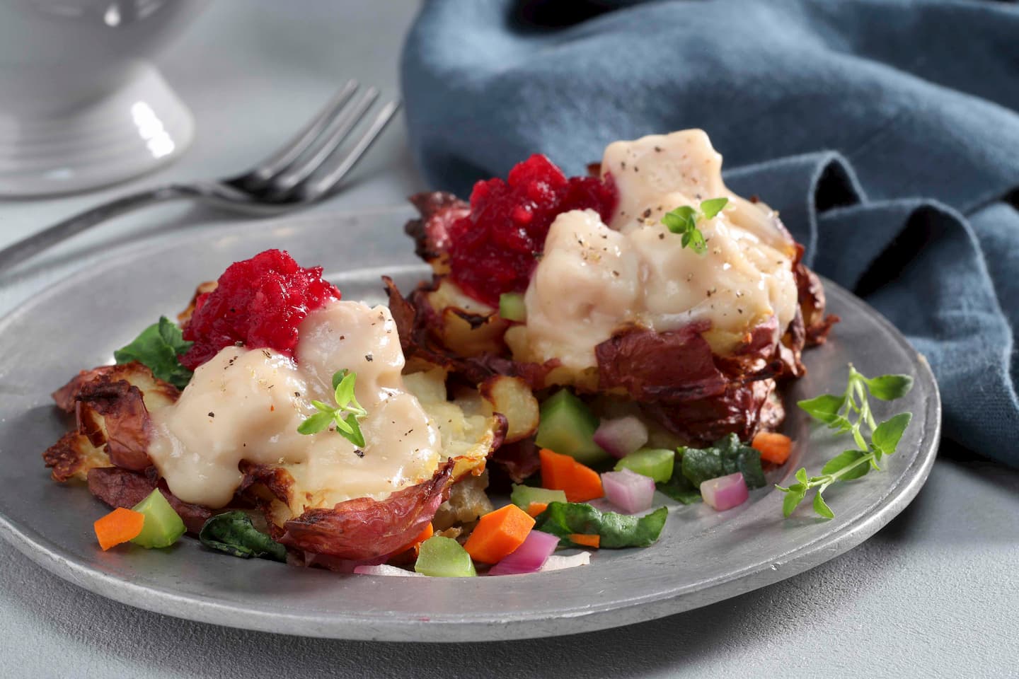 - Serve potatoes topped with turkey gravy and cranberry sauce garnished with fresh thyme sprigs, if desired.