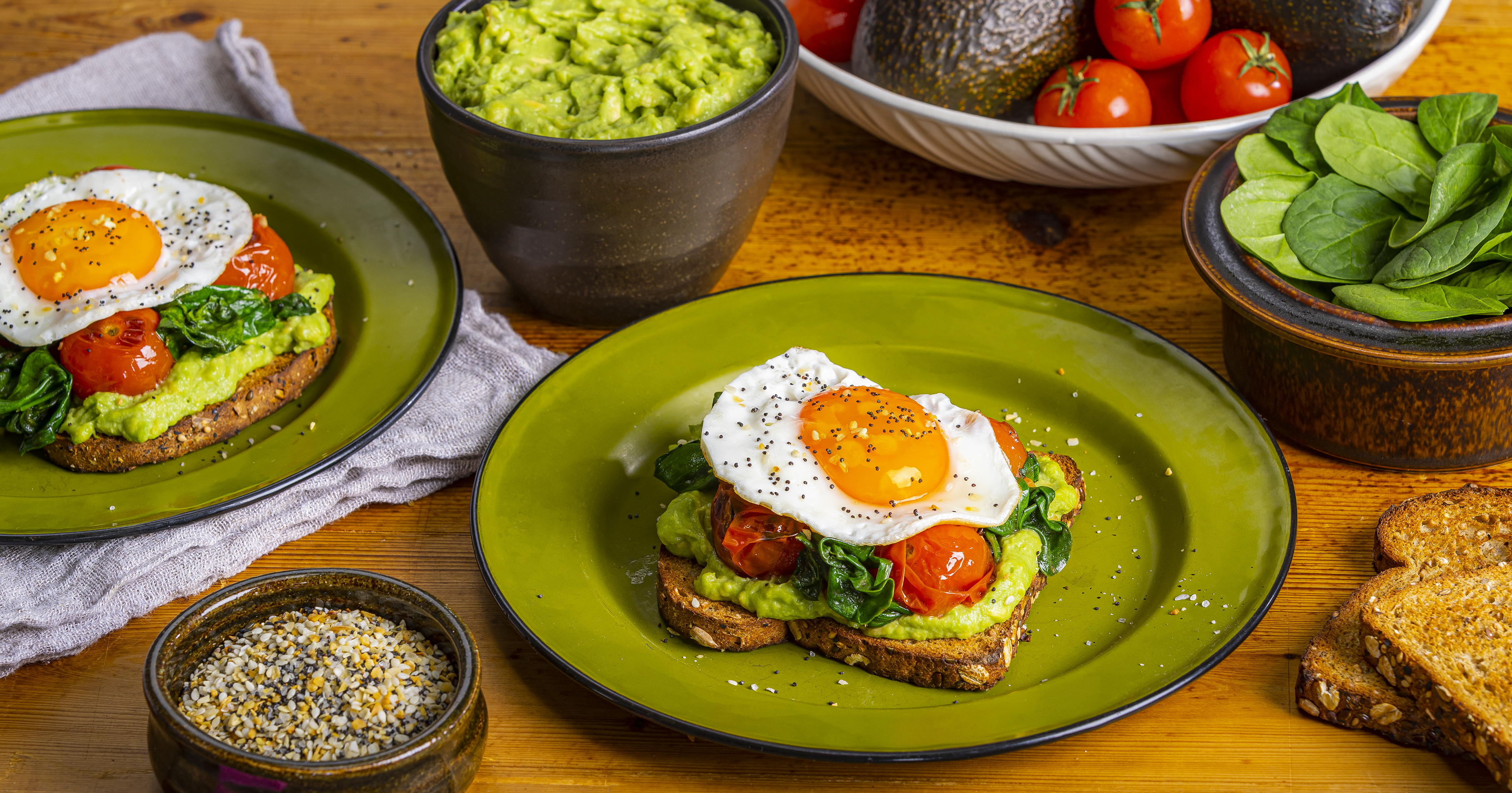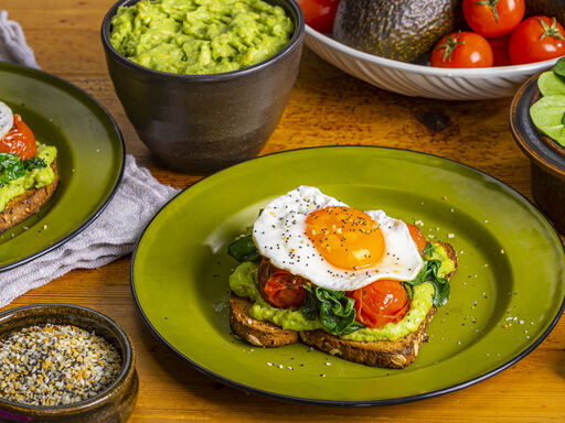 - Toast bread slices. Spread toast with avocado; top with tomato mixture, eggs and seasoning. Makes 4 toasts.
