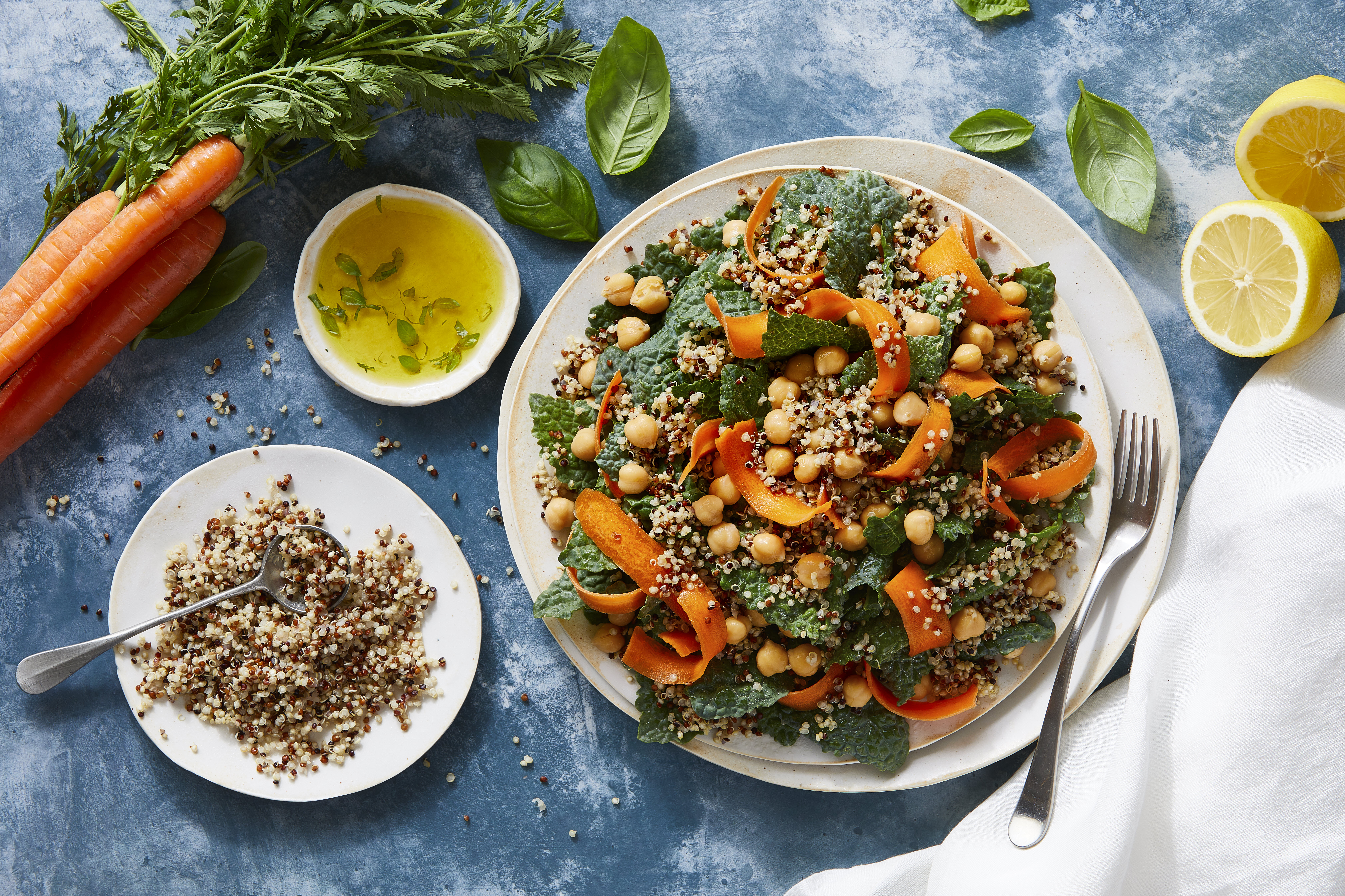 - Whisk lemon juice, oil, basil, vinegar, sugar, garlic powder and salt in a large bowl; fold in kale, quinoa, carrots and beans. Makes about 2½ cups.
