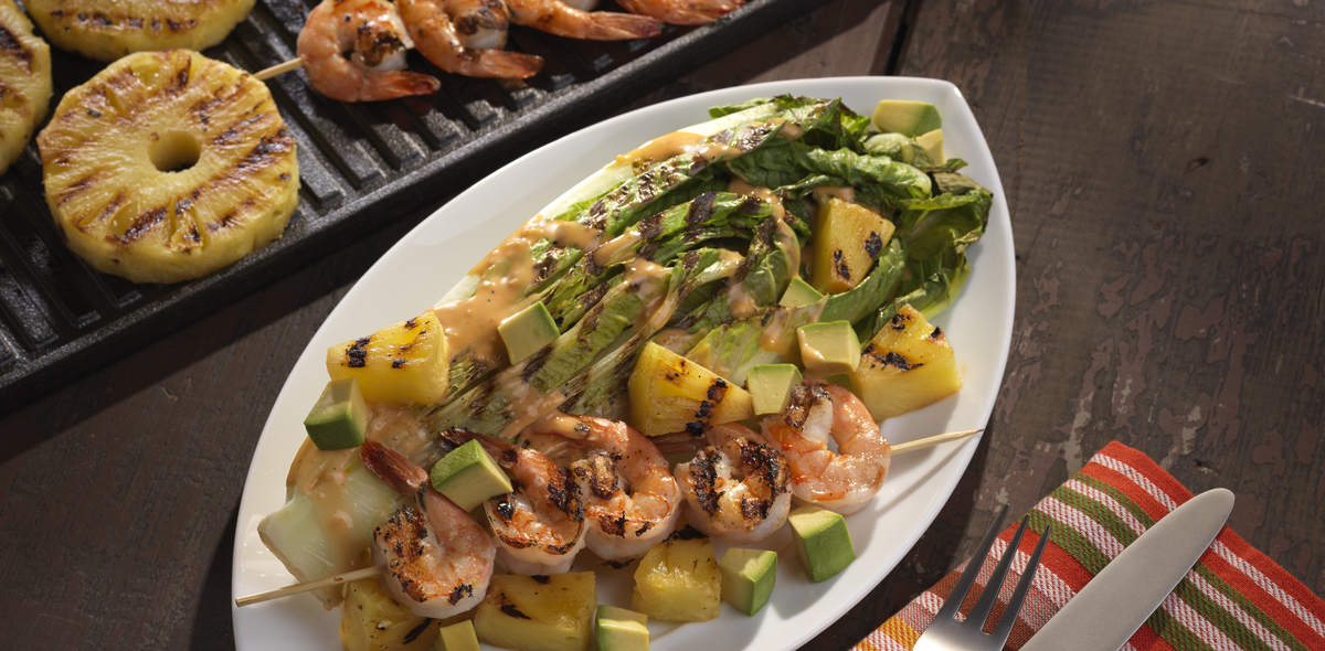 - Remove shrimp, pineapple and lettuce from grill. Remove shrimp from skewers and chop the pineapple into chunks. Set aside.