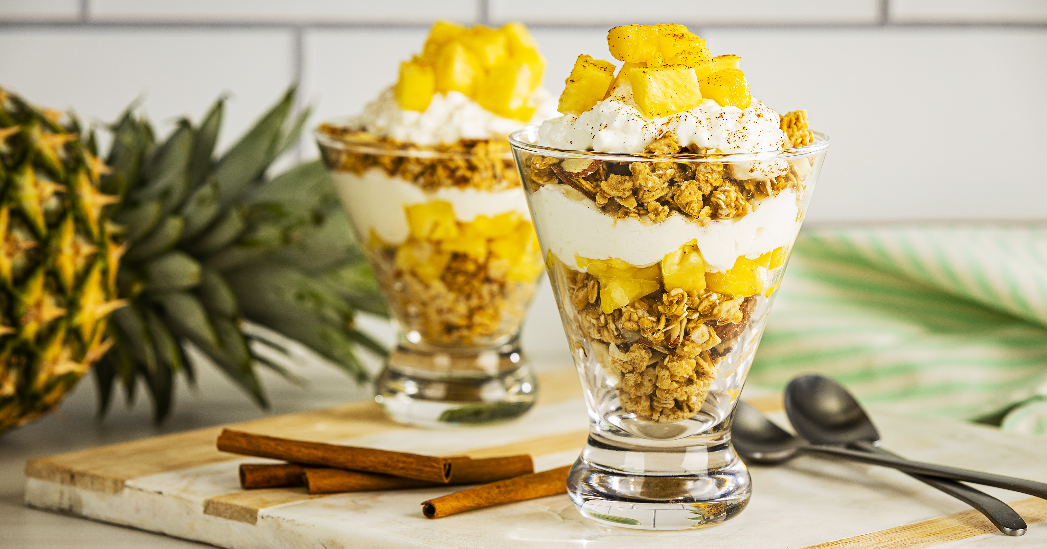 Layer granola, cottage cheese and pineapple in parfait glasses. Garnish with a dash of ground cinnamon, if desired.